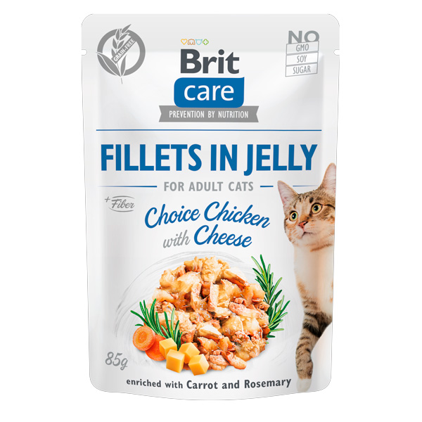 Brit Care file fără cereale cu pui, branză, morcovi și rozmarin în jeleu, pentru pisici adulte.Pui moale în jeleu îmbogățit cu rozmarin și morcovi favorizează digestia sănătoasă.Fără cereale, OMG-uri, zahăr și soia – potrivit pentru pisici cu alergii alimentare.Ingrediente: 85% carne în fileuri.