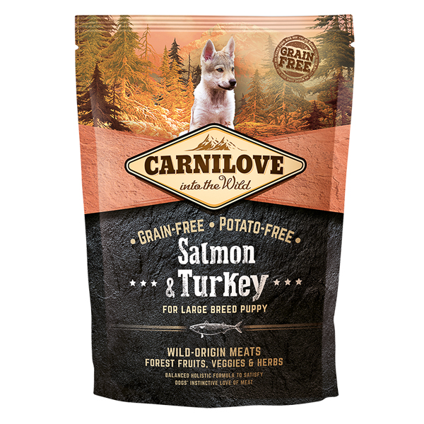 Hrană uscată superpremium pentru caței din rase mari. Formula fără cereale și fără cartofi pentru caței din rase mari (mai mult de 25 kg). Somonul este o sursă excelentă de proteine extrem de digerabile, precum și omega-3 acizi grași nesaturați, care au un impact pozitiv asupra dezvoltării mentale, sistemul cardiovascular și al metabolismul (reduce nivelul de zahăr din sânge). De asemenea, aceasta influențează în mod pozitiv calitatea și aspectul parului și a pielii. Curcanul este bogat în proteine digerabile și are un nivel ridicat de oligoelemente, cum ar fi zinc și de asemenea, conține vitamina B3 si B6, care sunt critice pentru buna funcționare a creierului, asigura un tonus muscular bun, și o creștere sănătoasă.