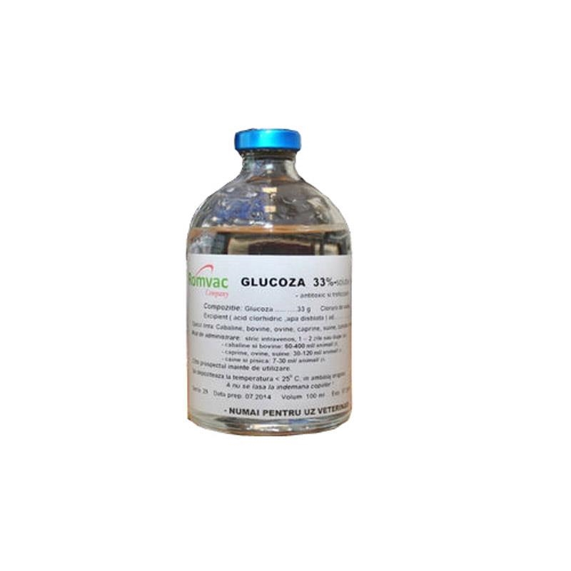 Soluţia apoasă de GLUCOZĂ 33% apirogenă, hipertonă şi sterilă este destinată troficizării hepatice şi susţinerii funcţiei miocardului la animalele epuizate şi hipoglicemice, consecutiv unor intoxicaţii, enteropatii, cetonemii, hepatite, miocardite şi hemoragii. Se utilizează, de asemenea, în stări de şoc traumatic sau chirurgical, în arsuri şi septicemii sau la animale convalescente.