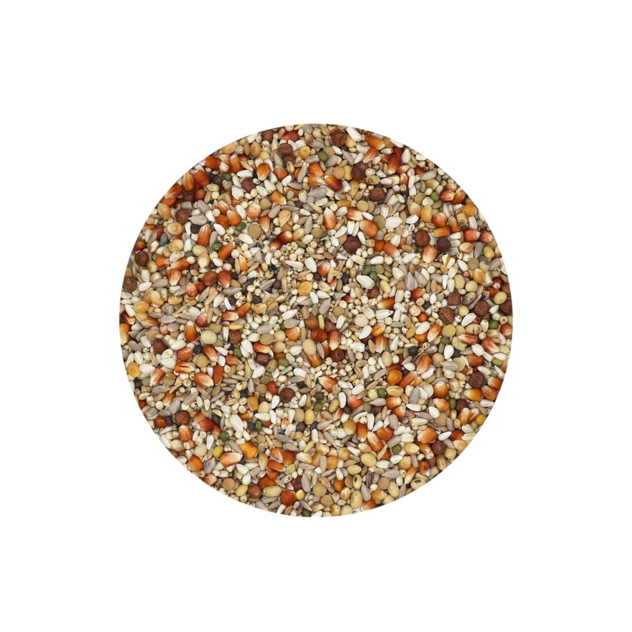 porumb roșu 15%, porumb galben mic 10%, boabe de soia prăjite 5%, mazăre maple 4%, neghină 2%, linte 3%, fasole mung 2%, grâu porumbel alb 5%, dari galben 13%, șofrănel 12%, orez negru 2%, orez decorticat 4%, ovăz decorticat 5%, miez de floarea soarelui 8%, semințe de cânepă 4%, mei galben 2%, semințe de in galben 1%, semințe de rapiță neagră 2%, semințe de ciulin 1%.