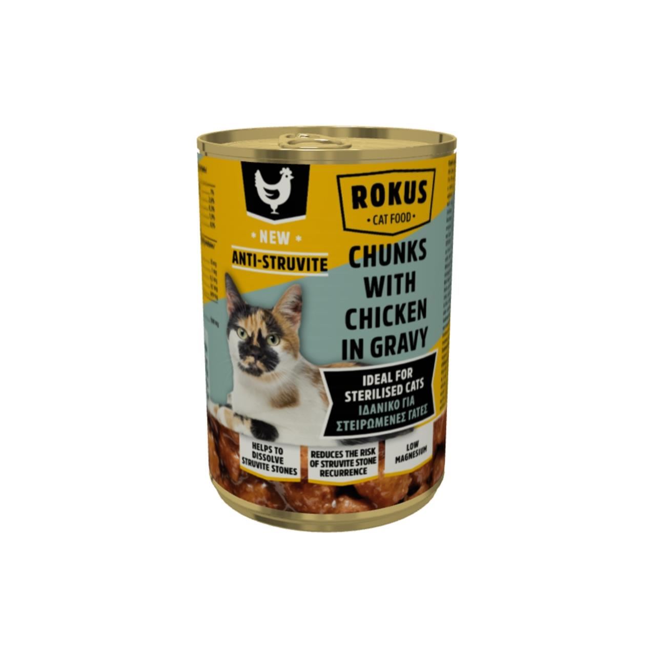 HRANĂ UMEDĂ PENTRU PISICI STERILIZATE ROKUS CONSERVĂ PUI ÎN SOS 415GR