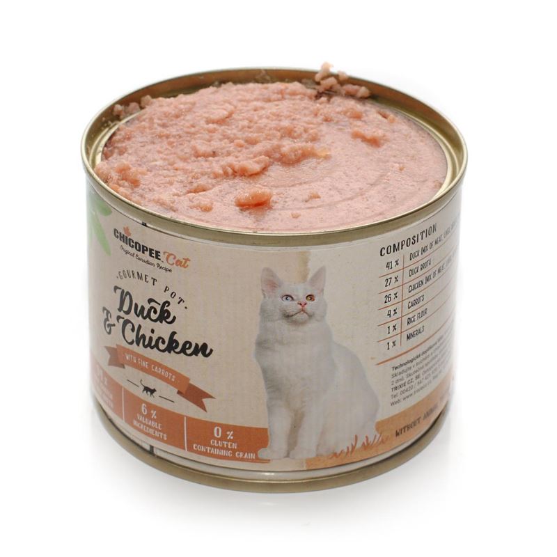 Conservele Chicopee reprezintă o hrană umedă completă cu rață și pui dedicată pisicilor adulte, produsă în Germania din carne și legume de calitate superioară.