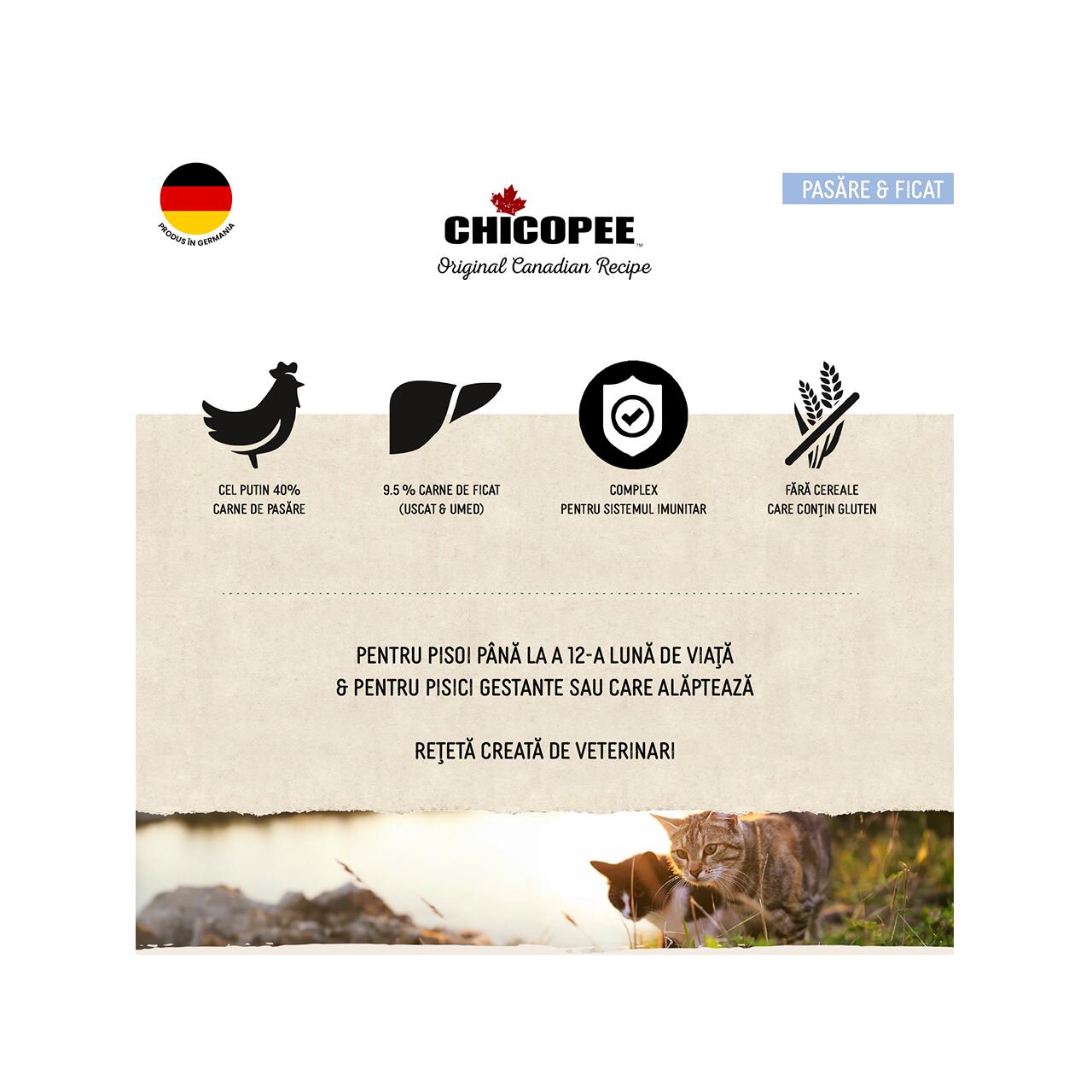 Chicopee KITTEN este o hrană completă echilibrată pentru pisoi până la a 12-a lună de viață, asigurând o dezvoltare optimă pentru pisoi sănătoși, în creștere, cu densitatea sa concentrată de nutrienți. Hrana ajută la susținerea apărării imunitare naturale, contribuind astfel la un sistem imunitar puternic. Concentrația crescută de nutrienți asigură suficientă îngrijire prenatală pentru dezvoltarea fătului la pisicile gestante și producția de lapte la pisicile care alăptează. Adaosul de 9.5% ficat (proaspăt și uscat) asigură o senzație gustativă extraordinară.