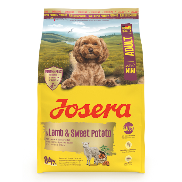 Hrană completă, uscată fără cereale, cu miel și cartofi dulci într-un sos delicios, pentru câini de talie mică. Hrana fără cereale, cu miel și cartofi dulci conține nu numai 84% proteine animale în proteina totală și o porție mare de aromă, dar mai ales pulbere delicioasă de sos. Acest lucru transformă în cel mai scurt timp o hrană uscată crocantă cu crochete mici într-o masă cu un sos gustos, dacă se adaugă apă. Compoziție: Proteină uscată de pasăre, Cartofi uscaţi, Cartofi dulci uscaţi 20%, Uleiuri și grăsimi, Pulpa de sfecla de zahar, Proteină uscată de miel 4%, Proteină hidrolizată pasăre, Proteină vegetală hidrolizată, Ficăţei uscaţi de pasăre, pereți celulari de drojdie 0,5%, Hemoglobină, Pudra de cicoare, Substanțe minerale. Constituenți analitici: proteină brută 26,0 %, grăsime brută 16,0 %, fibre brute 3,0 %, cenușă brută 7,5 %, calciu 1,50 %, magneziu 0,10 %, fosfor 1,00 %, sodiu 0,40 %