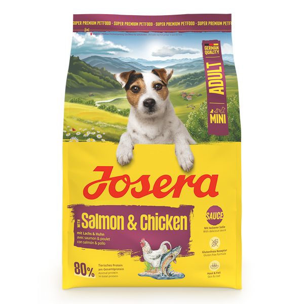 Hrană uscată fără gluten, cu somon, pui și sos delicios, pentru câini de talie mică. Compoziție: Proteina uscata de pasare 26,0 % (din care Pui 40,0 %), Porumb boabe întregi, Orez, Grasime de pasare, Pulpa de sfecla de zahar, Proteine din somon uscat 4%, Amidon din cartof, Amidon din cartof, Proteină hidrolizată pasăre, Proteină vegetală hidrolizată, Ficăţei uscaţi de pasăre, Substanțe minerale, Sange, Pudra de cicoare, Carne uscată a scoicii cu buze verzi (Perna canaliculus) din Noua Zeelandă. Constituenți analitici: proteină brută 26,0 %, grăsime brută 16,0 %, fibre brute 3,0 %, cenușă brută 6,5 %, calciu 1,40 %, magneziu 0,10 %, fosfor 1,00 %, sodiu 0,40 %