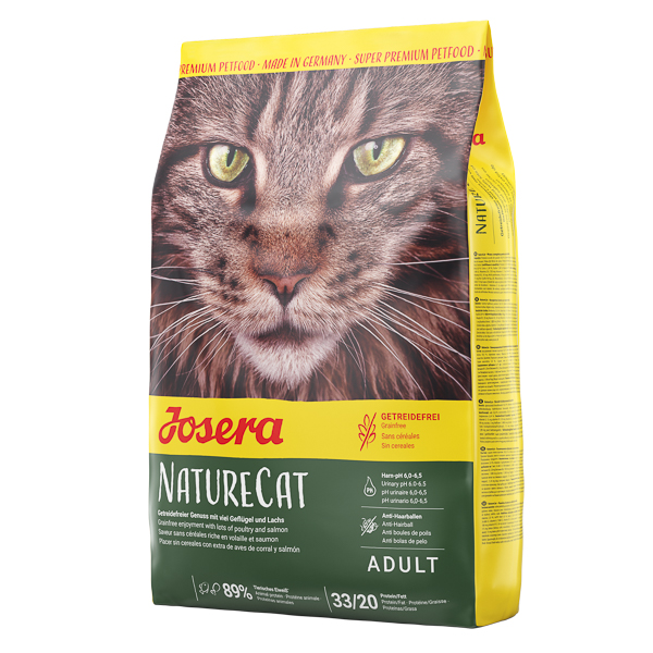 Hrană completă pentru pisici adulteJosera NatureCat este o adevărată plăcere pentru toți aventurierii. Fără cereale, cu o porție extra de pasăre și somon gustoase.Cu 30% carne de pasăre uscată și 10% somon uscat (echivalentul a aproximativ 130 g de carne crudă la 100g de hrană uscată)Ierburile aromatice selecționate și fructele sănătoase perfecționează rețeta și oferă pisicii dumneavoastră o schimbare gustoasăAcizii grași valoroși, vitaminele și oligoelementele asigură o piele sănătoasă și o blană strălucitoareSe susține formarea unui pH de 6,0 – 6,5 în urină, putând acționa împotriva formării calculilor urinari