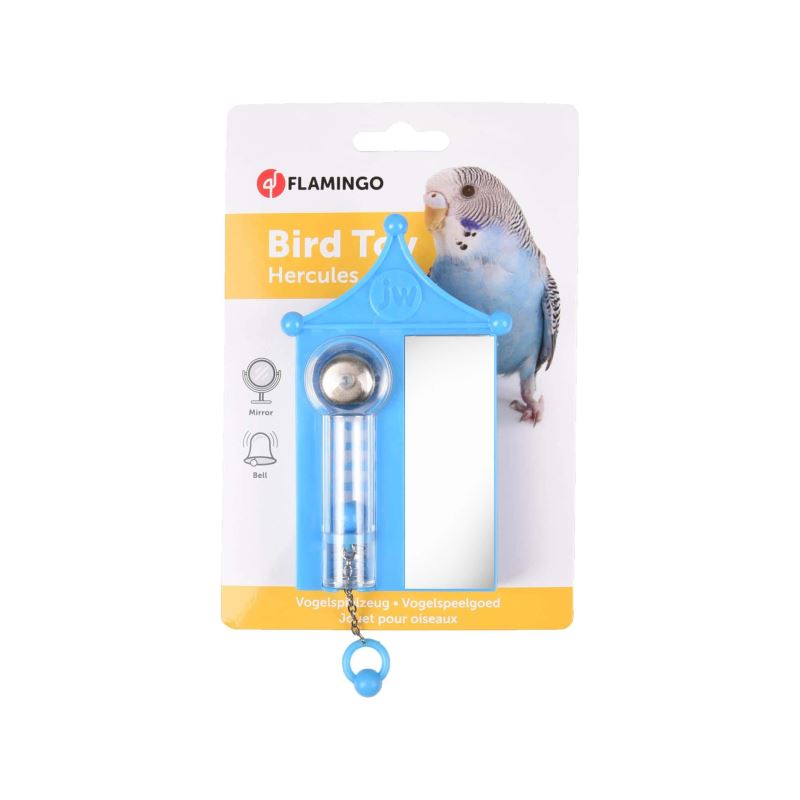 Jucărie cu oglindă și bilă distractivă acționată de un arc. Oglinda și culoarea bleu vor atrage imediat atenția păsărilor. Ideală pentru peruși sau alte păsări de talie mică.