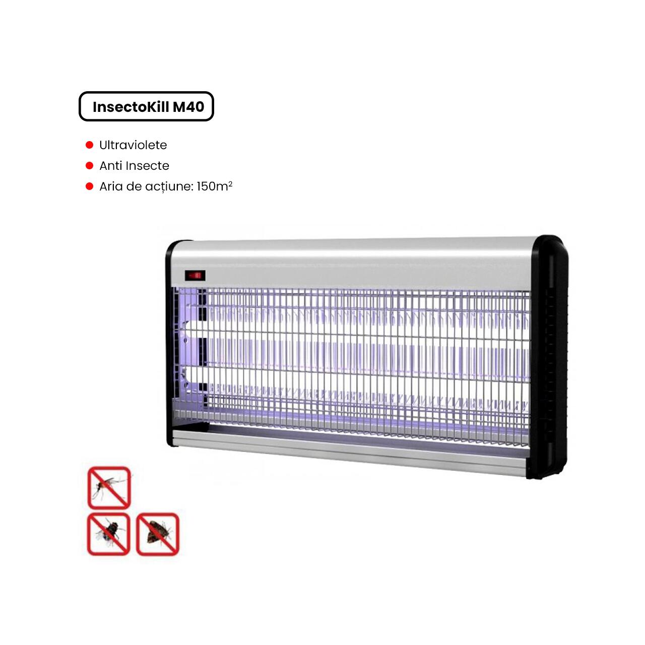 DENUMIREA PRODUSULUILAMPA UV ANTI-INSECTE INSECTOKILL M40Aparat Profesional anti tantari, anti muste, anti molii, anti insecte cu 2 tuburi UV si cu suprafata de actiune de 150 mp.Modelul …