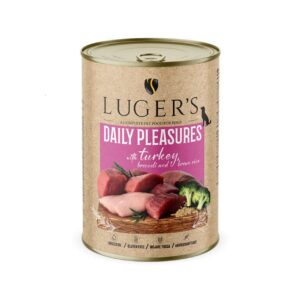 Compoziția hranei umede Luger’s Daily Pleasures cu curcan, broccoli și orez brun se bazează pe carne și organe comestibile cu o pondere mare de țesut muscular din specii precum curcan, pui, porc și vită. Compoziția variată a materiilor prime garantează o valoare nutritivă ridicată a proteinelor și grăsimilor. Toate materiile prime de origine animală, în special carnea de curcan, se caracterizează prin parametri înalți de digestibilitate, datorită cărora sunt absorbite și metabolizate rapid. Această compoziție face ca hrana să fie recomandată în special câinilor cu tract digestiv sensibil. Adăugarea de orez brun și broccoli oferă atât carbohidrați ușor digerabili, cât și compuși valoroși biologic activi, cu proprietăți antiinflamatorii puternice. Rozmarinul uscat, pe lângă faptul că afectează palatabilitatea alimentelor, are proprietăți antioxidante. Mâncarea a fost îmbogățită cu ingrediente datorită cărora întreaga compoziție îndeplinește funcții strict definite. Mojave yucca îmbunătățește peristaltismul intestinal și stimulează funcțiile digestive ale tractului digestiv, uleiul de in oferă acizi grași valoroși care favorizează funcțiile pielii. Adaosul de vitamina D3 asigură o mai bună absorbție a calciului, zincul îmbunătățește funcția pielii și aspectul blănii, iodul este responsabil pentru cursul eficient al proceselor metabolice, iar vitamina E acționează ca un antioxidant. Hrana umedă completă Luger’s Daily Pleasures cu curcan, broccoli și orez brun este o alegere ideală în dieta zilnică a câinilor adulți, în special a celor cu tract digestiv delicat.