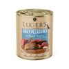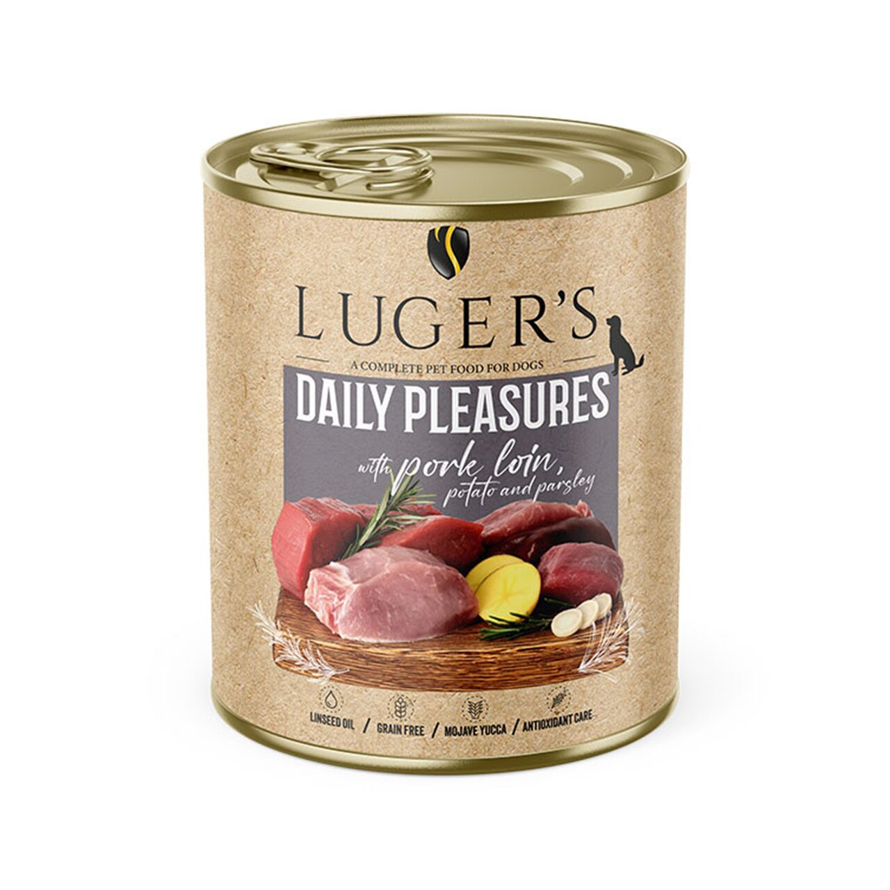 Linia de hrană umedă Luger’s Daily Pleasures este un produs conceput pentru hrănirea zilnică a câinilor adulți de toate rasele. Compoziția și proporțiile selectate cu precizie ale materiilor prime individuale cu cea mai mare valoare nutritivă acoperă cererea pentru toți nutrienții, ținând cont de liniile directoare nutriționale moderne. Baza formulei alimentare este carnea și organele de înaltă calitate. Datorită acestui fapt, un câine adult primește cantitatea potrivită de proteine ​​de valoare completă, bogate în toți aminoacizii exogeni, grăsimi și, odată cu aceasta, acizii grași, atât saturați, cât și polinesaturați, și majoritatea componentelor vitaminelor și mineralelor. Adăugarea de legume asigură cantitatea necesară de carbohidrați, care garantează cursul corect al tuturor proceselor metabolice. Substanțele biologic active conținute în aditivi, precum sucul de sfeclă roșie pudră și rozmarinul, protejează împotriva efectelor negative ale stresului oxidativ și, influențând activitatea secretorie a tubului digestiv, reglează procesele digestive. Compoziția variată, prezența multor aditivi valoroși în formulă și metoda de producție asigură palatabilitatea ridicată a alimentelor Luger’s Daily Pleasures.