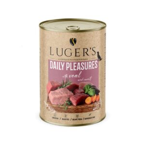 Linia de hrană umedă Luger’s Daily Pleasures este un produs conceput pentru hrănirea zilnică a câinilor adulți de toate rasele. Compoziția și proporțiile selectate cu precizie ale materiilor prime individuale cu cea mai mare valoare nutritivă acoperă cererea pentru toți nutrienții, ținând cont de liniile directoare nutriționale moderne. Baza formulei alimentare este carnea și organele de înaltă calitate. Datorită acestui fapt, un câine adult primește cantitatea potrivită de proteine de valoare completă, bogate în toți aminoacizii exogeni, grăsimi și, odată cu aceasta, acizii grași, atât saturați, cât și polinesaturați, și majoritatea componentelor vitaminelor și mineralelor. Adăugarea de legume asigură cantitatea necesară de carbohidrați, care garantează cursul corect al tuturor proceselor metabolice. Substanțele biologic active conținute în aditivi, precum sucul de sfeclă roșie pudră și rozmarinul, protejează împotriva efectelor negative ale stresului oxidativ și, influențând activitatea secretorie a tubului digestiv, reglează procesele digestive. Compoziția variată, prezența multor aditivi valoroși în formulă și metoda de producție asigură palatabilitatea ridicată a alimentelor Luger’s Daily Pleasures.