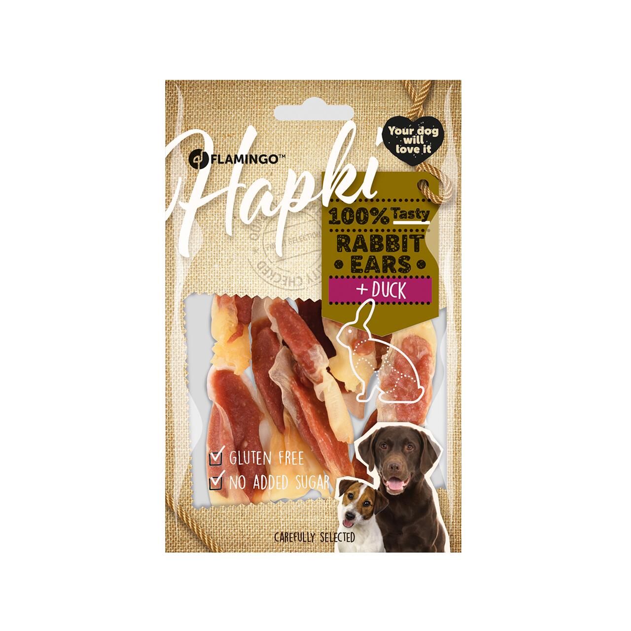 RECOMPENSE PENTRU CÂINI FLAMINGO SNACK HAPKI URECHI DE IEPURE ÎNVELITE ÎN RAȚĂ 85G