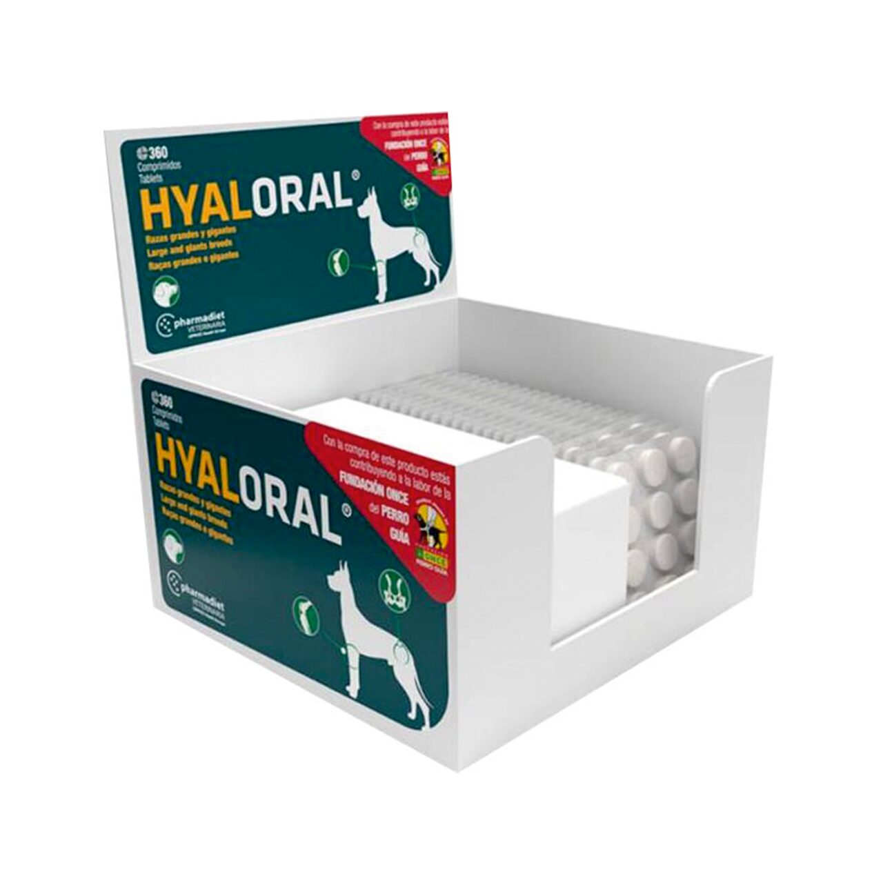 Pentru animalele cu greutatea mai mare de 40 kg, se administrează 2 tablete. Produsul se administrează ca atare sau încorporat în dieta obișnuită. Se recomandă încorporarea tabletelor de hyaloral în dieta zilnică, timp de cel puțin 3 luni. În funcție de necesități, efectuați 2 sau mai multe cure de tratament pe an. La animalele supraponderale se recomandă controlarea dietei pentru optimizarea procesului de recuperare funcțională. Se prezintă sub formă de tablete divizabile și apetente pentru o administrare ușoară și precisă în raport cu talia și greutatea animalului.